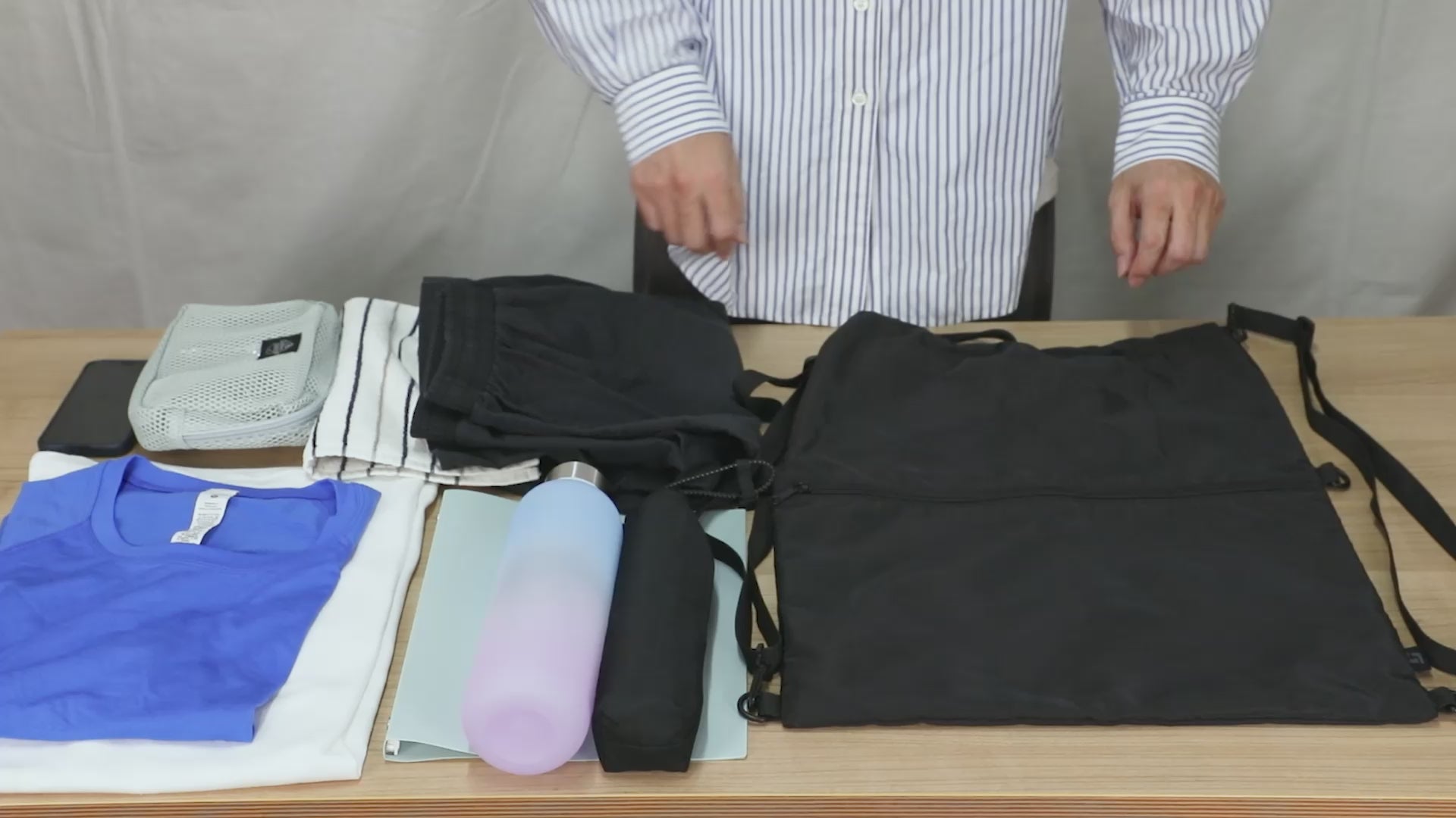 コンパクトな見た目ながら、しっかり荷物が入る頼れるサイズ感。ジム用品や日常の必需品も余裕で収納できます。 -
